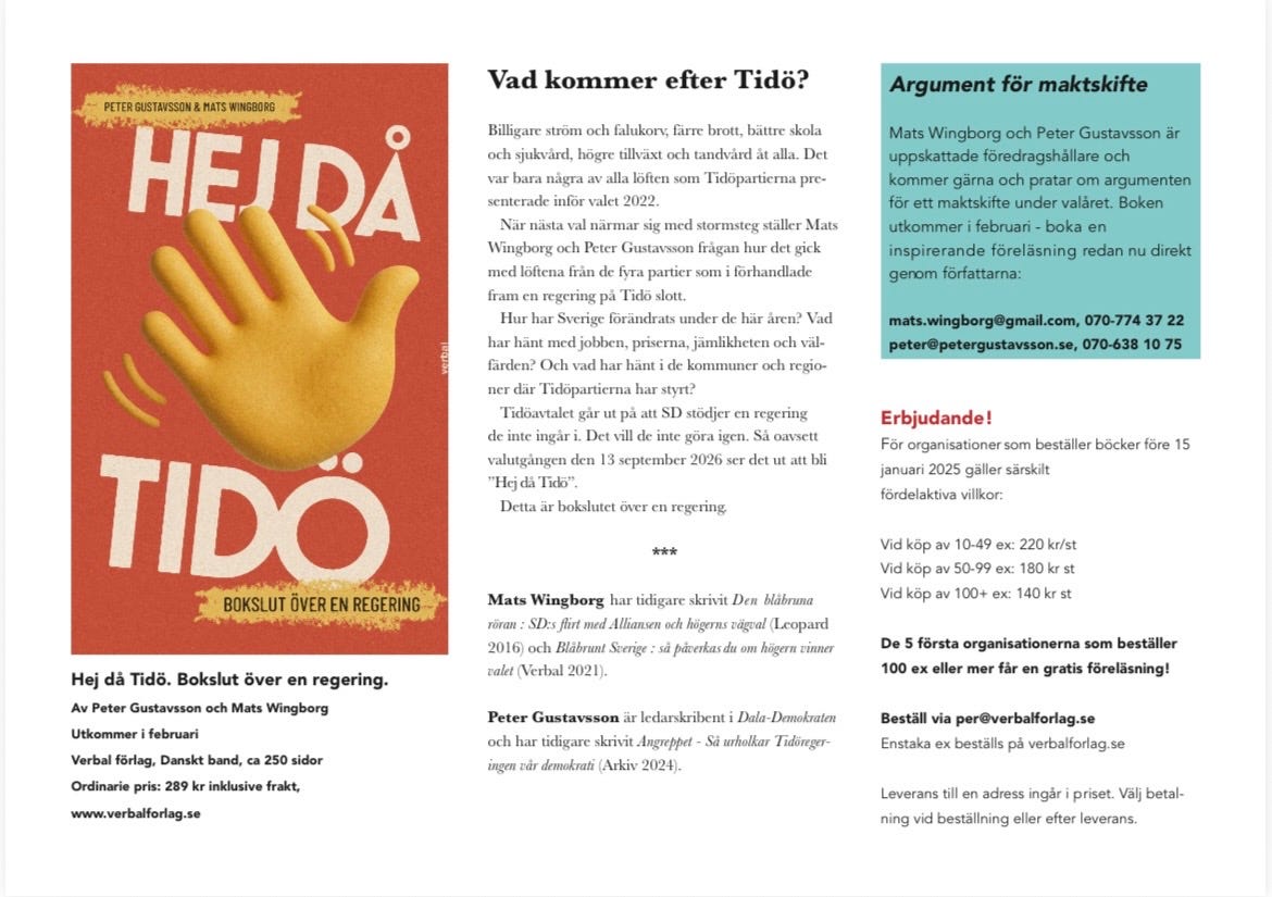 ”Hej då Tidö – Bokslut över en regering” utkommer i februari, men om du vill göra en större beställning redan nu går det utmärkt. Du kan också boka in en föreläsning på temat. Boken innehåller en studiehandledning som gör den väl lämpad för att läsas som studiecirkel.